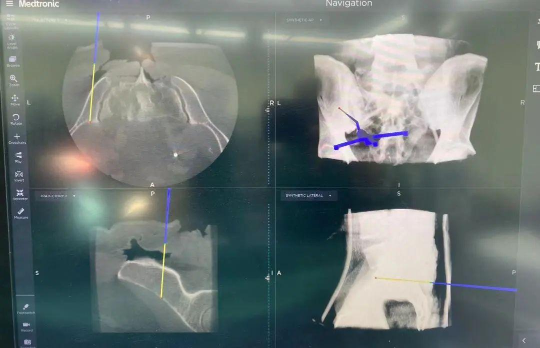 精準切除腫瘤后,借助骨腫瘤科自主研發(fā)的3D打印組合式半側骶骨假體進行重建。并在O臂導航系統(tǒng)的引導下,精確放置假體和螺釘,進一步提升患者的重建效果。此外,該系統(tǒng)還可以縮短手術時間,加快患者的康復。
