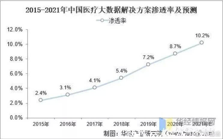 從滲透率來(lái)看,醫(yī)療大數(shù)據(jù)解決方案整體滲透率是指醫(yī)療大數(shù)據(jù)解決方案的銷售收入占中國(guó)醫(yī)療信息化投資總額的百分比,2019年我國(guó)醫(yī)療大數(shù)據(jù)解決方案滲透率為7.2%,預(yù)計(jì)到2021年這一滲透率將超10%。