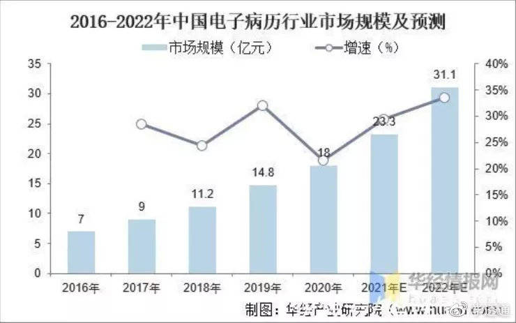 電子病歷作為中國(guó)醫(yī)療信息化改革中的基礎(chǔ)部分,其市場(chǎng)增長(zhǎng)快于整體醫(yī)療信息化市場(chǎng)的增長(zhǎng)。從2016年的7億元增長(zhǎng)至2020年的18億元,年均復(fù)合增長(zhǎng)率達(dá)26.6%,預(yù)計(jì)2022年將達(dá)31.1億元的市場(chǎng)規(guī)模。