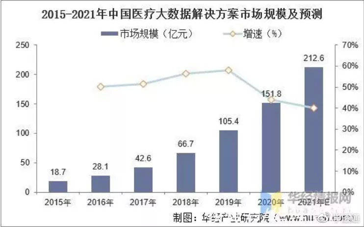 作為中國(guó)醫(yī)療行業(yè)整體信息化投資的一部分,中國(guó)醫(yī)療大數(shù)據(jù)解決方案市場(chǎng)可分為醫(yī)院、監(jiān)管機(jī)構(gòu)及政策制定者以及生命科學(xué)等三大領(lǐng)域。數(shù)據(jù)顯示,2020年中國(guó)醫(yī)療大數(shù)據(jù)解決方案市場(chǎng)為超過(guò)150億元,預(yù)計(jì)到2021年將增長(zhǎng)至212.6億元。