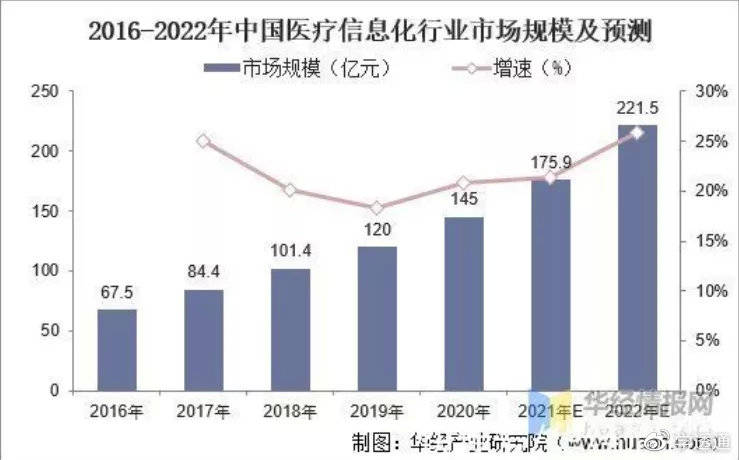 近年,中國(guó)醫(yī)療信息化市場(chǎng)規(guī)??焖僭鲩L(zhǎng)。中國(guó)醫(yī)療信息化市場(chǎng)規(guī)模從2016年的67.5億元增長(zhǎng)至2020年的145億元,年均復(fù)合增長(zhǎng)率達(dá)21.1%。隨著未來(lái)醫(yī)療行業(yè)的繼續(xù)發(fā)展,預(yù)計(jì)2022年將達(dá)221.5億元。