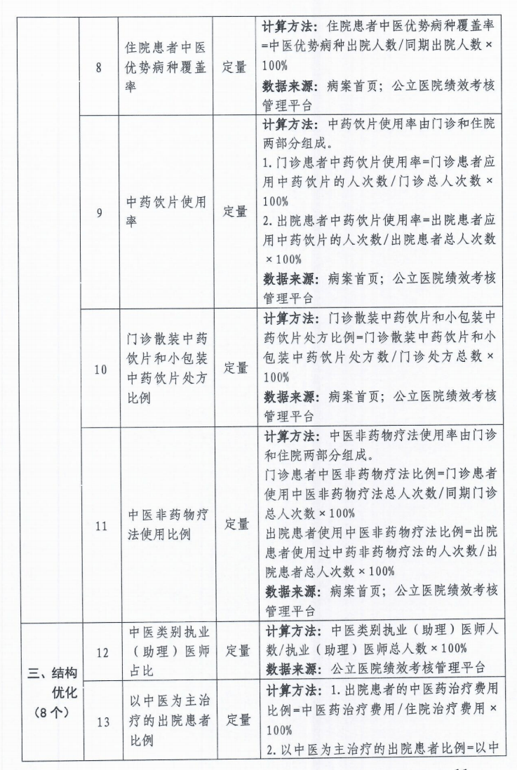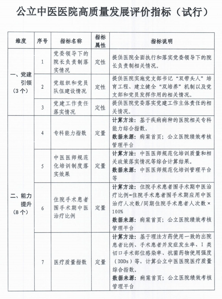 近日,國家衛(wèi)生健康委、國家中醫(yī)藥管理局聯(lián)合印發(fā)《公立醫(yī)院高質(zhì)量發(fā)展評(píng)價(jià)指標(biāo)(試行)》《公立中醫(yī)醫(yī)院高質(zhì)量發(fā)展評(píng)價(jià)指標(biāo)(試行)》,公布了公立醫(yī)院及公立中醫(yī)醫(yī)院高治療發(fā)展的評(píng)價(jià)指標(biāo),具體內(nèi)容圍繞黨建引領(lǐng)、能力提升、結(jié)構(gòu)優(yōu)化、創(chuàng)新增效、文化聚力5個(gè)方面展開,具體細(xì)化為18個(gè)和24個(gè)評(píng)價(jià)指標(biāo)。