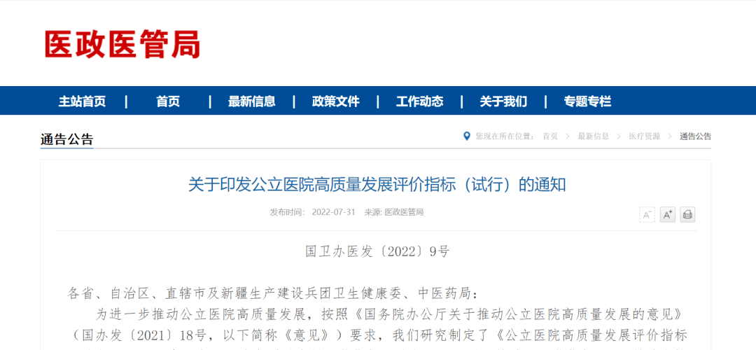 據(jù)了解,2021年,國務(wù)院辦公廳印發(fā)《國務(wù)院辦公廳關(guān)于推動(dòng)公立醫(yī)院高質(zhì)量發(fā)展的意見》(簡(jiǎn)稱《發(fā)展意見》),明確了公立醫(yī)院高質(zhì)量發(fā)展的相關(guān)要求,提出建立公立醫(yī)院高質(zhì)量發(fā)展評(píng)價(jià)指標(biāo)體系。