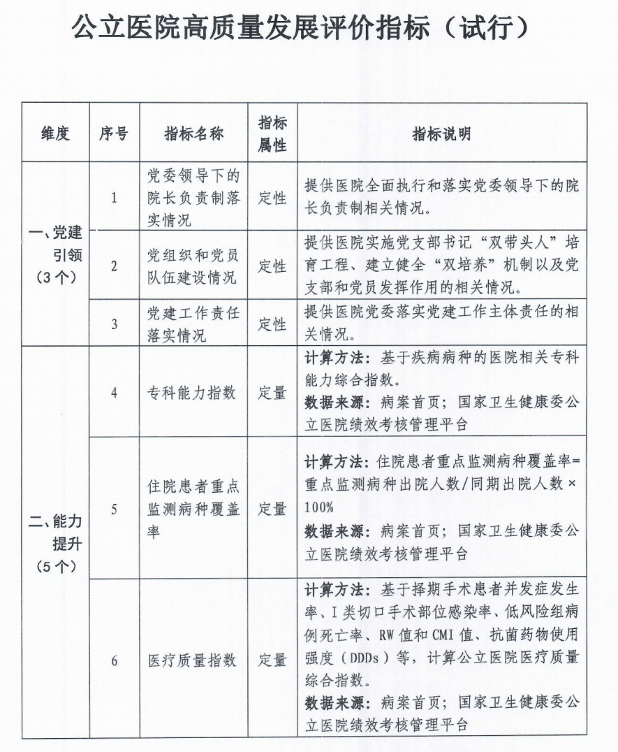 國家衛(wèi)生健康委要求,公立醫(yī)院高質(zhì)量發(fā)展評(píng)價(jià)工作與公立醫(yī)院績(jī)效考核工作同步推進(jìn)。省級(jí)衛(wèi)生健康行政部門(含中醫(yī)藥主管部門,下同)可以結(jié)合經(jīng)濟(jì)社會(huì)發(fā)展水平和重點(diǎn)工作,適當(dāng)補(bǔ)充反映本地區(qū)公立醫(yī)院高質(zhì)量發(fā)展的特色指標(biāo)。