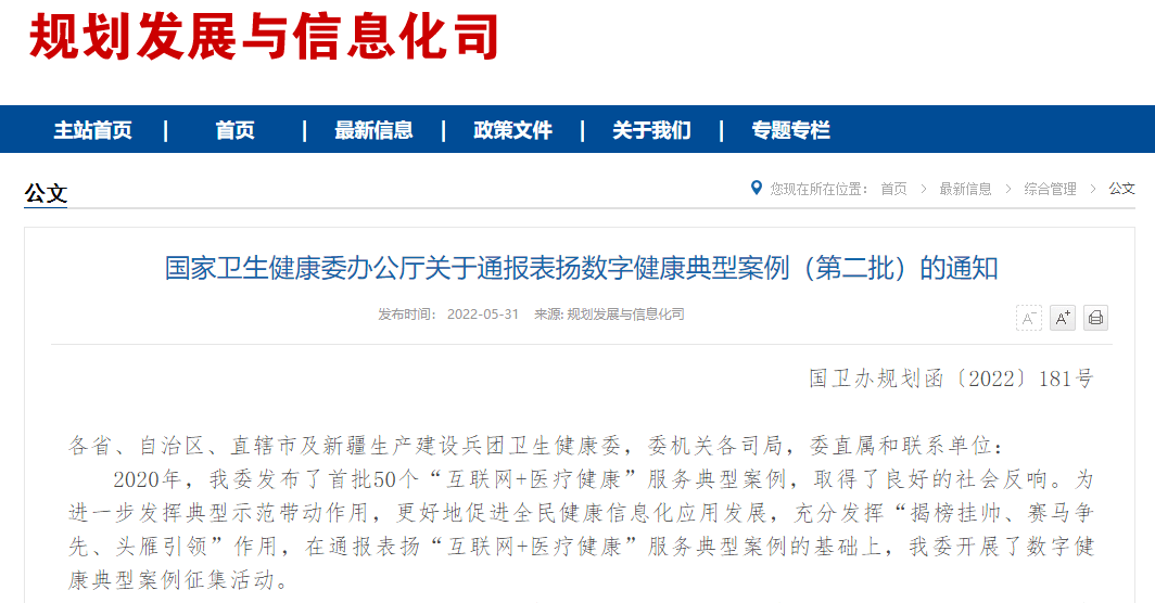 5月31日,國家衛(wèi)生健康委辦公廳發(fā)布《關(guān)于通報(bào)表揚(yáng)數(shù)字健康典型案例(第二批)的通知》,共評選出100個(gè)典型案例及10個(gè)可復(fù)制推廣的示范案例。吉林大學(xué)第一醫(yī)院《醫(yī)“網(wǎng)”服務(wù),“智”在就醫(yī)——基于互聯(lián)網(wǎng)醫(yī)院的智慧醫(yī)院建設(shè)》作為10個(gè)可復(fù)制推廣示范案例之一,得到國家衛(wèi)生健康委的通報(bào)表揚(yáng)。