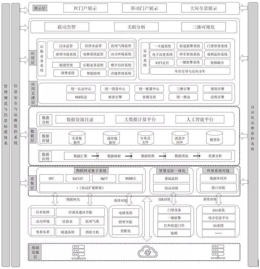 應用層包括醫(yī)院后勤業(yè)務系統(tǒng)和智慧安防系統(tǒng),而后勤業(yè)務系統(tǒng)主要分為后勤運營管理和設備智能管控兩大部分。。通過數(shù)據(jù)層對各業(yè)務子系統(tǒng)的數(shù)據(jù)整合與算力算法支持,實現(xiàn)業(yè)務層的跨子系統(tǒng)的關(guān)聯(lián)性分析和場景聯(lián)動,并基于醫(yī)院三維模型進行實時的動態(tài)交互。