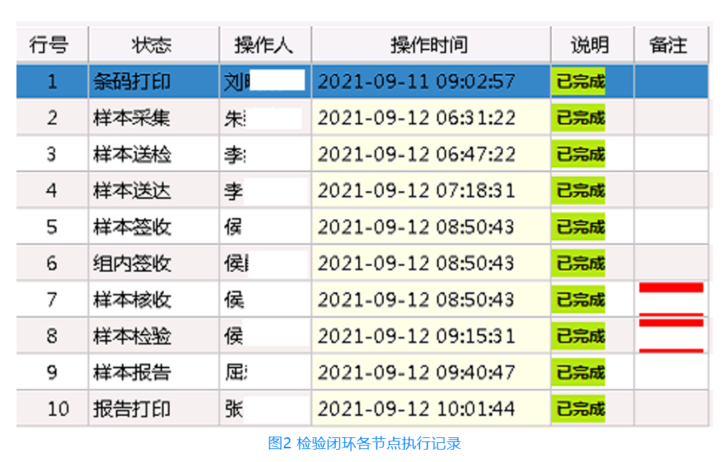 通過(guò)運(yùn)用條碼技術(shù),增加覆蓋全部病區(qū)的簽到條碼。第三方工作人員到達(dá)病區(qū)后通過(guò)PDA掃碼簽到,取到標(biāo)本后系統(tǒng)生成樣本送檢執(zhí)行記錄,樣本送達(dá)指定實(shí)驗(yàn)室后,生成樣本送達(dá)記錄。LIS配置了樣本送檢、樣本送達(dá)模塊,設(shè)置對(duì)應(yīng)的操作人、操作時(shí)間及完成情況信息采集功能。條碼技術(shù)的應(yīng)用細(xì)化了檢驗(yàn)標(biāo)本信息閉環(huán)節(jié)點(diǎn),使樣本的采集、送檢、送達(dá)、簽收、檢驗(yàn)、報(bào)告的環(huán)節(jié)全程可跟蹤,實(shí)現(xiàn)樣本信息的全程無(wú)紙化數(shù)據(jù)記錄。優(yōu)化后的檢驗(yàn)標(biāo)本示蹤圖例見圖1。各任務(wù)節(jié)點(diǎn)執(zhí)行記錄見圖2。