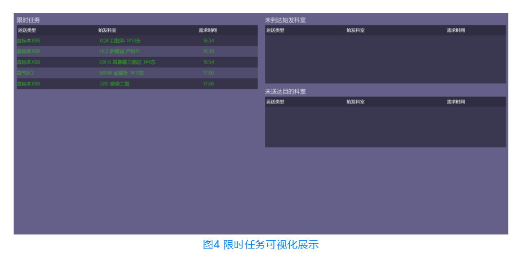 標(biāo)本管理全流程可視化與標(biāo)本狀態(tài)實(shí)時(shí)呈現(xiàn) 為了直觀呈現(xiàn)檢驗(yàn)標(biāo)本實(shí)時(shí)狀態(tài),實(shí)現(xiàn)標(biāo)本轉(zhuǎn)運(yùn)實(shí)時(shí)監(jiān)控的目標(biāo),醫(yī)院對(duì)標(biāo)本全流程可視化管理進(jìn)行改進(jìn)。運(yùn)用臨床支持服務(wù)信息系統(tǒng)數(shù)據(jù),從各科室標(biāo)本數(shù)量、標(biāo)本產(chǎn)生時(shí)間、標(biāo)本接收時(shí)間、運(yùn)送員任務(wù)列表、標(biāo)本當(dāng)前狀態(tài)等多維度進(jìn)行可視化展示,醫(yī)生、護(hù)士、第三方管理人員可實(shí)時(shí)掌握標(biāo)本狀態(tài)。第三方調(diào)度員針對(duì)未及時(shí)取送的任務(wù)進(jìn)行監(jiān)控與催辦。醫(yī)務(wù)人員可實(shí)時(shí)獲得標(biāo)本檢驗(yàn)進(jìn)度并獲得檢驗(yàn)完成消息推送,不延誤患者下一步診療計(jì)劃。運(yùn)送任務(wù)可視化和限時(shí)任務(wù)可視化分別見圖3、圖4。