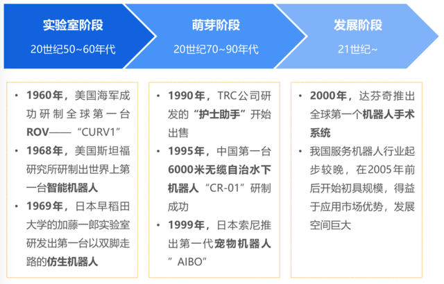 隨著人工智能技術(shù)的演進(jìn)和市場(chǎng)需求的變化與時(shí)俱進(jìn),服務(wù)機(jī)器人的發(fā)展歷程大致可分為三個(gè)階段: