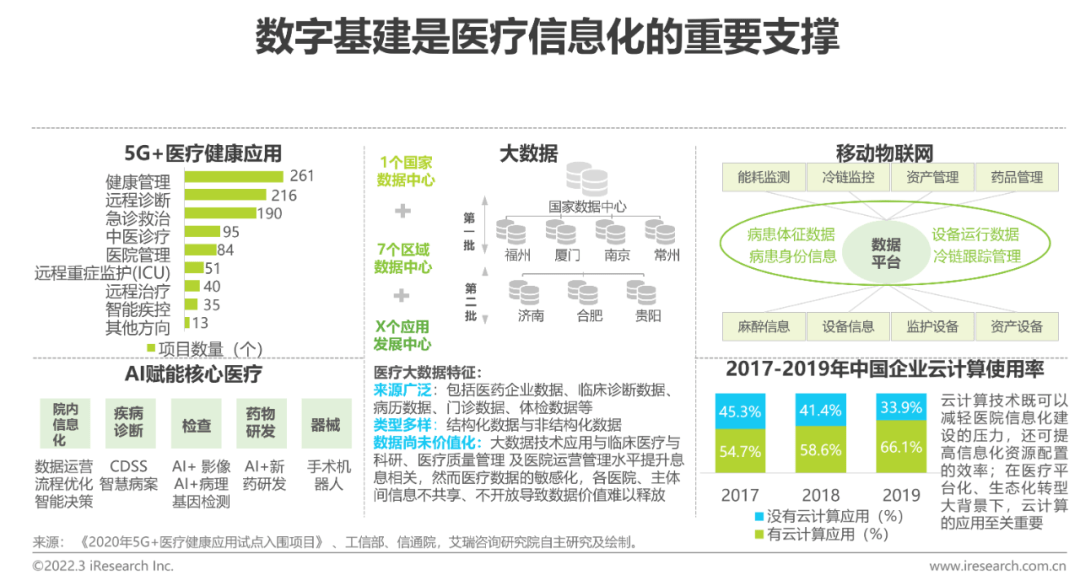 另一方面,數(shù)字基建逐步完善,信息技術(shù)的創(chuàng)新發(fā)展,為醫(yī)療信息化帶來更多機遇。5G、大數(shù)據(jù)、移動物聯(lián)網(wǎng)、云計算等是醫(yī)療信息化的技術(shù)底座,支撐大量垂直醫(yī)療場景的信息化應(yīng)用。