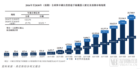 從商業(yè)化速度來(lái)看,支氣管鏡手術(shù)機(jī)器人在全球的裝機(jī)速度較快。根據(jù)弗若斯特沙利文的報(bào)告,經(jīng)自然腔道手術(shù)機(jī)器人全球市場(chǎng)規(guī)模近年持續(xù)快速增長(zhǎng),由2016年的人民幣2140萬(wàn)元增至2020年的人民幣5.2億元,年復(fù)合增長(zhǎng)率為122.2%,預(yù)期2030年將進(jìn)一步增至人民幣257.4億元,年復(fù)合增長(zhǎng)率為47.7%。