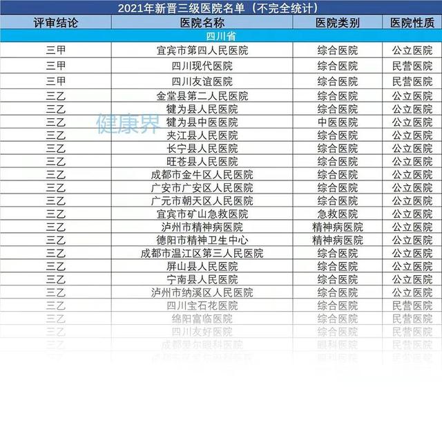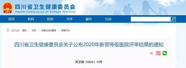2021年4月2日,四川省衛(wèi)生健康委公布的新晉等級醫(yī)院評審結(jié)果中,成都市22家醫(yī)院新晉等級。其中,新晉三甲醫(yī)院12家,三乙醫(yī)院6家,二甲醫(yī)院4家,晉級醫(yī)院數(shù)量創(chuàng)歷史之最。