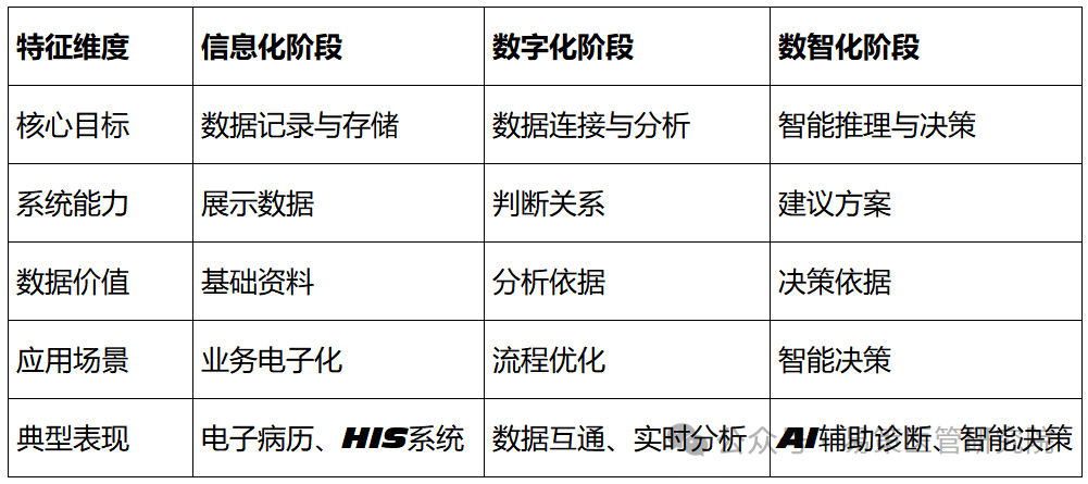醫(yī)院數(shù)智化轉型不是一蹴而就的過程,而是從“信息化"到“數(shù)字化"再到“智能化"的漸進發(fā)展。其核心是讓數(shù)據(jù)從“存儲"走向“決策",從“展示"走向“推理"。