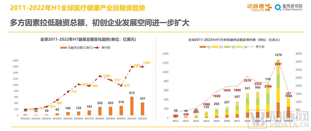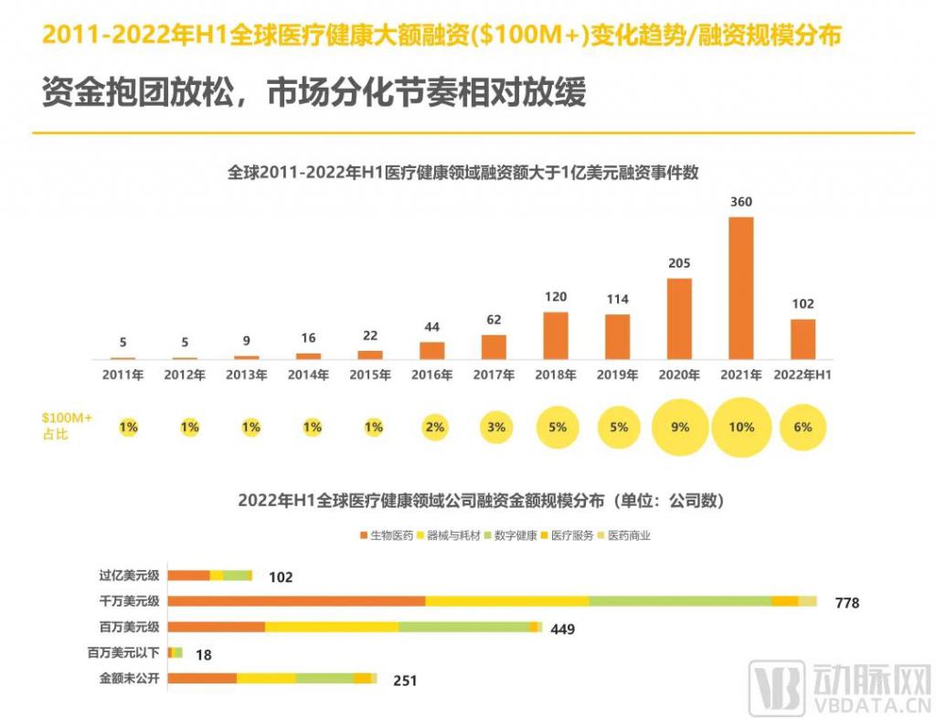 與 2021 年一樣,全球經濟的景氣程度在 2022 年 H1 仍舊欠缺,不過相比 2020-2021 年醫(yī)療健康產業(yè)的防御性促使的資金抱團,2022 年 H1 的資金抱團現象明顯減輕,初創(chuàng)企業(yè)的勢頭持續(xù)上漲。