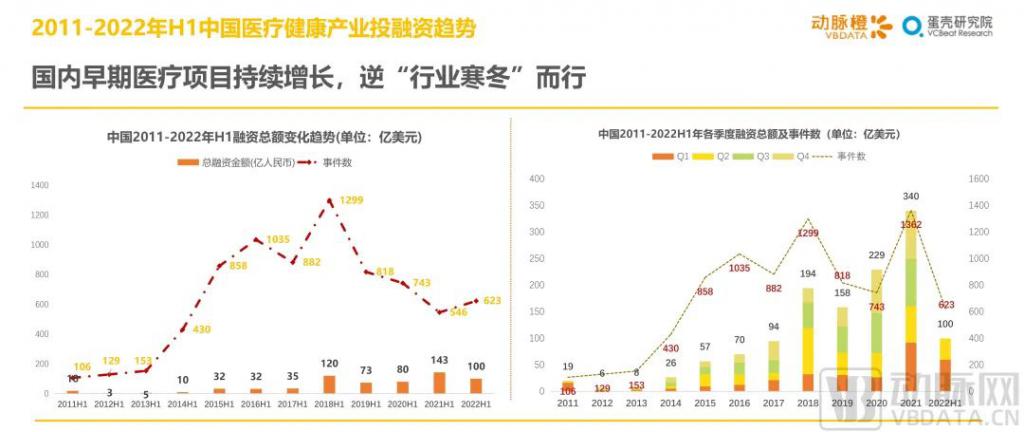 2022 年 H1,中國醫(yī)療健康產業(yè)投融資總額近 100 億美元(約 647.59 億人民幣),同比下降超 40%;與此同時國內融資交易數量為到 623 起,較 2021 年 H1 增加 77 起。