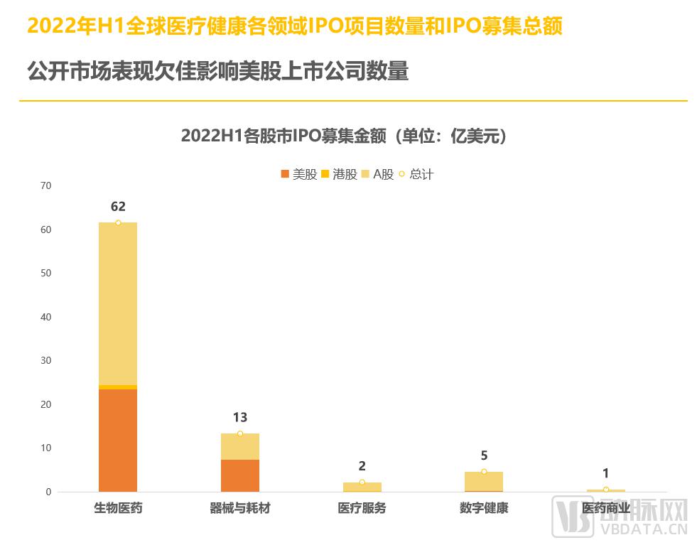 據動脈橙數據庫顯示,2022 年 H1,在 A 股、美股以及港股上市的醫(yī)療健康領域企業(yè)共 59 家,募集總額超 86.68 億美元,同比 2021 年無論數量還是金額均有大幅度下滑;且與以往美股企業(yè)占去 " 半壁江山 " 的情況不同,2022 年 A 股和美股上市企業(yè)數量差距縮小。