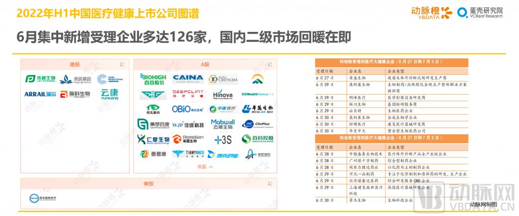 不過,國內二級市場的低迷局面有望在下半年打破。在 6 月 27 日到 6 月 29 日的短短三天里,已經有 5 家醫(yī)療健康企業(yè)向港交所遞交招股說明書;科創(chuàng)板、創(chuàng)業(yè)板新增受理企業(yè)達到了創(chuàng)記錄的 126 家,且有 5 家企業(yè)成功過會。