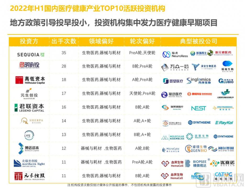 2022 年 H1,國內醫(yī)療健康最為活躍的機構是紅杉資本中國基金,全年破紀錄的累計出手 35 次,其投資標的以生物醫(yī)藥公司為主。