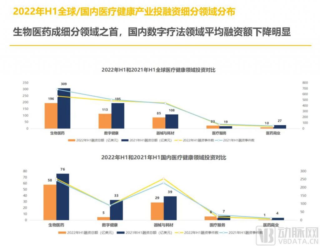 2022 年 H1,全球生物醫(yī)藥領域以 565 起交易、196.3 億美元(約 1316.05 億人民幣)成細分領域之首。數字健康領域和醫(yī)療器械領域分別以 484 起和 447 起交易緊隨其后。相較于 2021 年 H1,今年全球各領域整體融資總額和融資事件數都呈不同幅度的下降,數字健康領域尤為明顯,總額環(huán)比下降 42%。