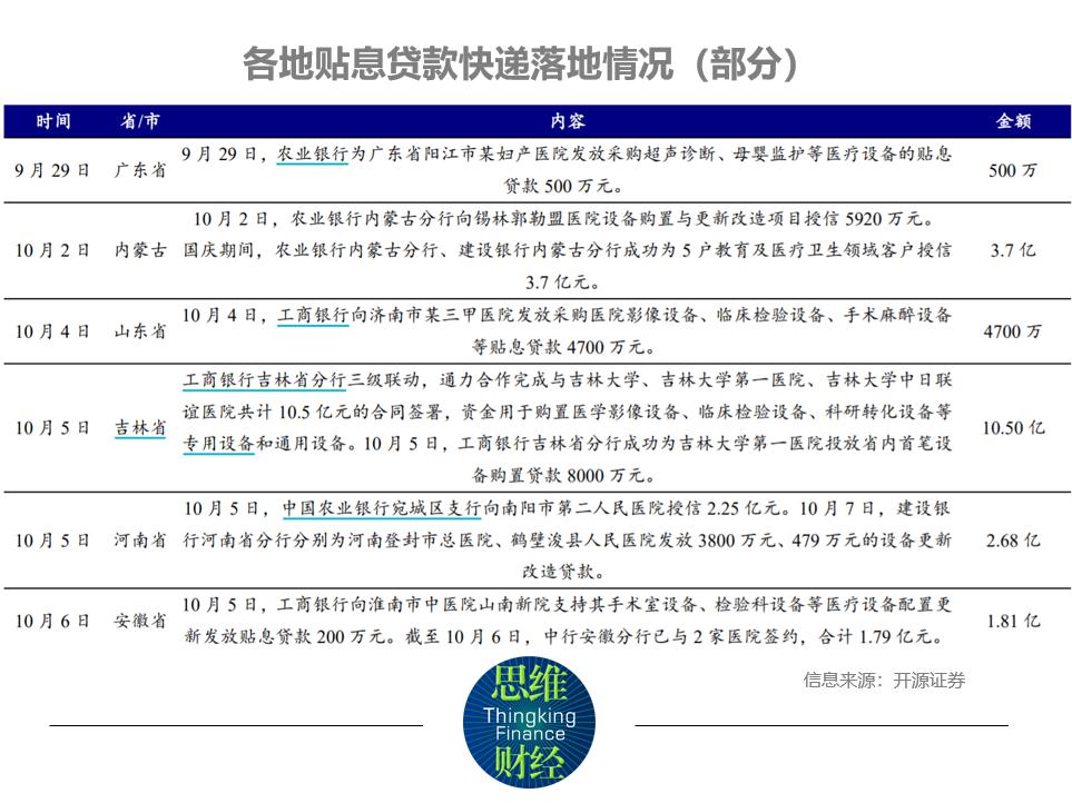 目前各省市積極響應政策,已開始執(zhí)行使用財政貼息貸款更新改造醫(yī)療設備需求的調查工作,截至 9 月 30 日,僅浙江、江蘇、安徽等省已上報約 180 億元的設備采購需求。全國數(shù)千億級醫(yī)療設備更新改造需求即將釋放。十一國慶期間財政貼息貸款項目單位與銀行積極簽約對接保障工作,目前各地貼息貸款快速落地,截至 10 月 11 日公開數(shù)據(jù),各省市已落地貼息金額約 191.55 億元。