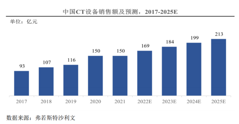 ??2021年,中國CT市場總規(guī)模達(dá)150億元,預(yù)計到2025年,中國CT設(shè)備總銷售額將增長至213億元,年復(fù)合增長率達(dá)到9.2%。