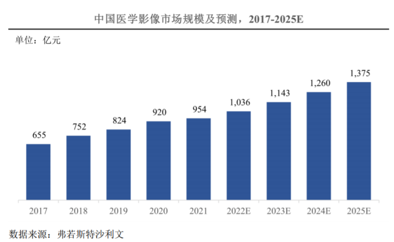 ??在市場需求及政策紅利的雙重驅(qū)動下,我國醫(yī)學(xué)影像設(shè)備市場規(guī)模將持續(xù)增長,具備良好的發(fā)展前景。2021年市場規(guī)模已達(dá)到954億元,預(yù)計2025年市場規(guī)模將達(dá)到1,375億元,年均復(fù)合增長率預(yù)計將達(dá)到9.6%。