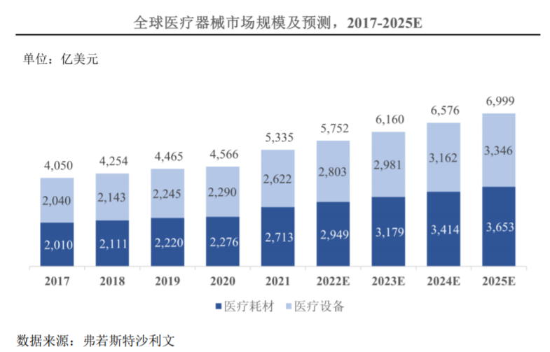 ??隨著全球人口老齡化問題的不斷加劇以及慢性病患者數(shù)的持續(xù)增加,推動了全球醫(yī)療器械市場的穩(wěn)定發(fā)展。自2017年至2021年,全球醫(yī)療器械市場規(guī)模從4,050億美元增長到5,335億美元,年復(fù)合增長率為7.1%。全民健康意識的進(jìn)一步提升將促進(jìn)該增長趨勢延續(xù),預(yù)計2025年全球醫(yī)療器械市場規(guī)模將增長到6,999億美元,其中醫(yī)療設(shè)備市場份額約占整體的47.81%。