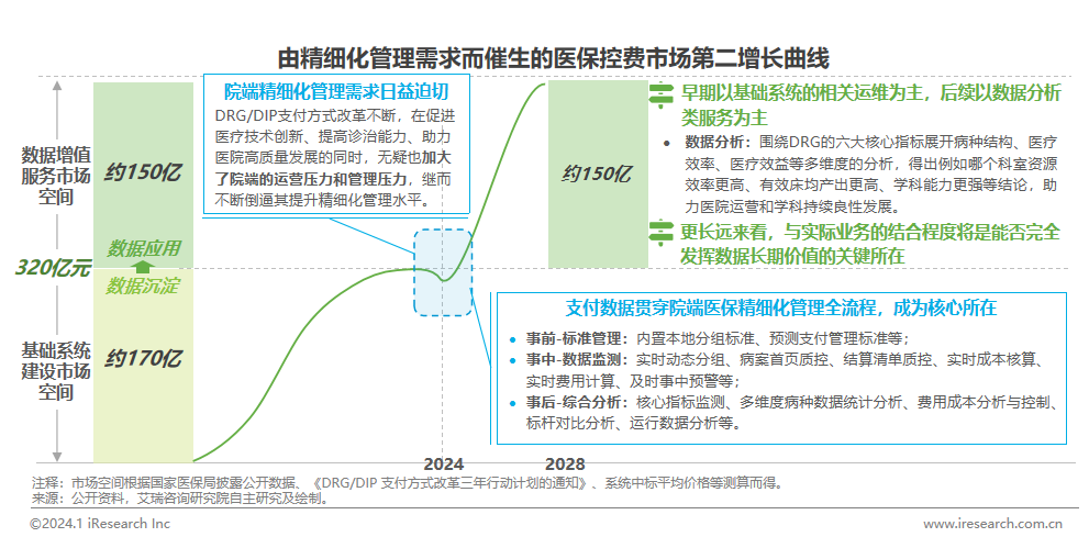2021年11月國家醫(yī)保局印發(fā)《DRG/DIP支付方式改革三年行動(dòng)計(jì)劃》,明確2025年底,DRG/DIP支付方式覆蓋所有符合條件的開展住院服務(wù)的醫(yī)療機(jī)構(gòu),基本實(shí)現(xiàn)病種、醫(yī)?;鹑采w。這帶動(dòng)了醫(yī)??刭M(fèi)市場的高速發(fā)展,預(yù)計(jì)其基礎(chǔ)系統(tǒng)建設(shè)市場空間約為170億元,且將于2024年全面釋放;隨著數(shù)據(jù)的進(jìn)一步沉淀,由院端精細(xì)化管理而催生的數(shù)據(jù)增值服務(wù)將成為醫(yī)??刭M(fèi)市場的第二增長點(diǎn),未來市場空間將達(dá)到約150億元。目前,DRG/DIP支付方式改革在我國已逐步邁入深水區(qū),未來院端將更加注重精細(xì)化運(yùn)營和數(shù)據(jù)驅(qū)動(dòng)的服務(wù),對于精細(xì)化管理的需求將帶動(dòng)相關(guān)增值服務(wù)市場的爆發(fā)。對于相關(guān)廠商而言,急需從過去跑馬圈地的同質(zhì)化競爭中脫離出來,用長期價(jià)值的思維來看待這樣一場變革,相較于大而全的傳統(tǒng)信息化廠商而言,專注醫(yī)保控費(fèi)業(yè)務(wù)的新興廠商或許將更有機(jī)會(huì)在第二增長曲線中脫穎而出。