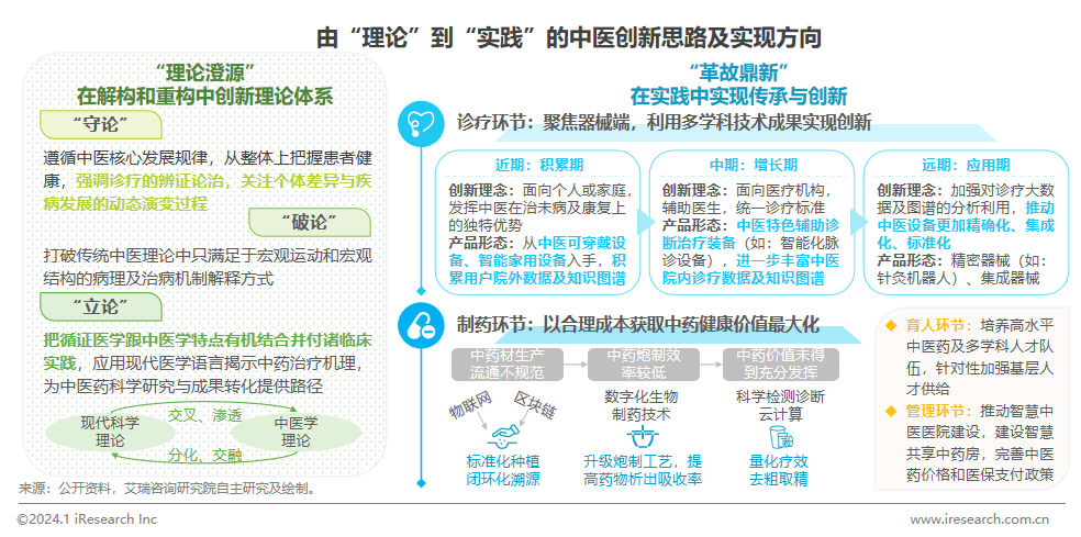 過去三年的新冠疫情抗擊中,中醫(yī)再次向世人展示了其蘊(yùn)藏的巨大潛力。但目前中醫(yī)發(fā)展面臨傳統(tǒng)病理及用藥機(jī)制的解釋難以令人信服;診療醫(yī)生水平參差不齊、標(biāo)準(zhǔn)不一,存在“千醫(yī)千方”的現(xiàn)象;中藥生產(chǎn)、流通、炮制等各大環(huán)節(jié)效率不足,藥物價(jià)值未得到充分發(fā)揮等問題。若要充分發(fā)揮中醫(yī)獨(dú)特的療法優(yōu)勢,就需要遵循中醫(yī)藥發(fā)展規(guī)律,守正創(chuàng)新。從理論著手,改變中醫(yī)傳統(tǒng)的理論表達(dá)方式,用現(xiàn)代科學(xué)語言重新闡述治病機(jī)理。明確中醫(yī)在人體系統(tǒng)關(guān)系及發(fā)展態(tài)勢上的優(yōu)勢經(jīng)驗(yàn)和特色理論,創(chuàng)造一套全新的疾病檢測方法和數(shù)據(jù)分析方法(如:在自然狀態(tài)下實(shí)時(shí)動(dòng)態(tài)檢測),將其運(yùn)用到中醫(yī)診療器械創(chuàng)新中去,持續(xù)升級現(xiàn)有中醫(yī)裝備性能,幫助醫(yī)生在診療手段上實(shí)現(xiàn)高質(zhì)量的標(biāo)準(zhǔn)統(tǒng)一;同時(shí),在理法方藥環(huán)節(jié)引入循證醫(yī)學(xué)研究及其他學(xué)科技術(shù),充分發(fā)揮藥物價(jià)值。未來,隨著中醫(yī)在人們生活上的逐漸滲透,中醫(yī)與健康養(yǎng)生、健康旅游等相關(guān)產(chǎn)業(yè)融合發(fā)展,有利于實(shí)現(xiàn)更好的經(jīng)濟(jì)、社會(huì)和生態(tài)效益。
