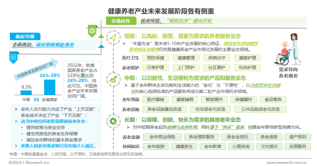 從全球養(yǎng)老產(chǎn)業(yè)發(fā)展情況來看,2022年歐美國家養(yǎng)老產(chǎn)業(yè)占GDP比重高達(dá)24%-29%,而中國僅為8.3%。我國養(yǎng)老產(chǎn)業(yè)仍處在初級階段,發(fā)展?jié)摿薮?。在政府不斷完善基本養(yǎng)老供給的基礎(chǔ)之上,隨著養(yǎng)老需求的日益旺盛,養(yǎng)老產(chǎn)業(yè)將從過去的社會(huì)資源消耗轉(zhuǎn)變?yōu)橄喈?dāng)比例人口需求的市場機(jī)會(huì)。著眼于老年人群的需求變遷,健康養(yǎng)老產(chǎn)業(yè)發(fā)展呈現(xiàn)出明顯的生存型到發(fā)展型階段特征,產(chǎn)業(yè)短期堅(jiān)持剛需、普惠的基本論調(diào);中期著眼于功能性產(chǎn)品和服務(wù)的發(fā)展;長期則偏重于養(yǎng)老支撐,同時(shí)探索更多“快樂”需求發(fā)展方向。由此可見,未來醫(yī)療、照護(hù)、金融等更多類型企業(yè)將競相涌入“銀發(fā)經(jīng)濟(jì)”市場,提供更為精準(zhǔn)、更多層次的產(chǎn)品與服務(wù),構(gòu)建多元化、生態(tài)化的健康養(yǎng)老服務(wù)業(yè)態(tài)。