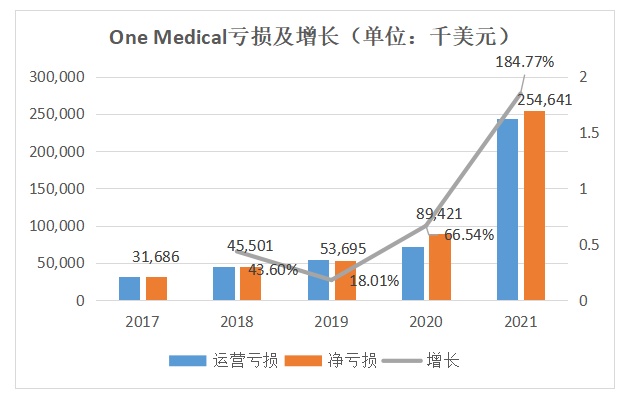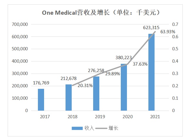 2017至2021年,One Medical營收連年實現(xiàn)增長,從2017年的1.77億美元增至2021年的6.23億美元。增長率也一直在增加,2021年的增長率達到63.93%。