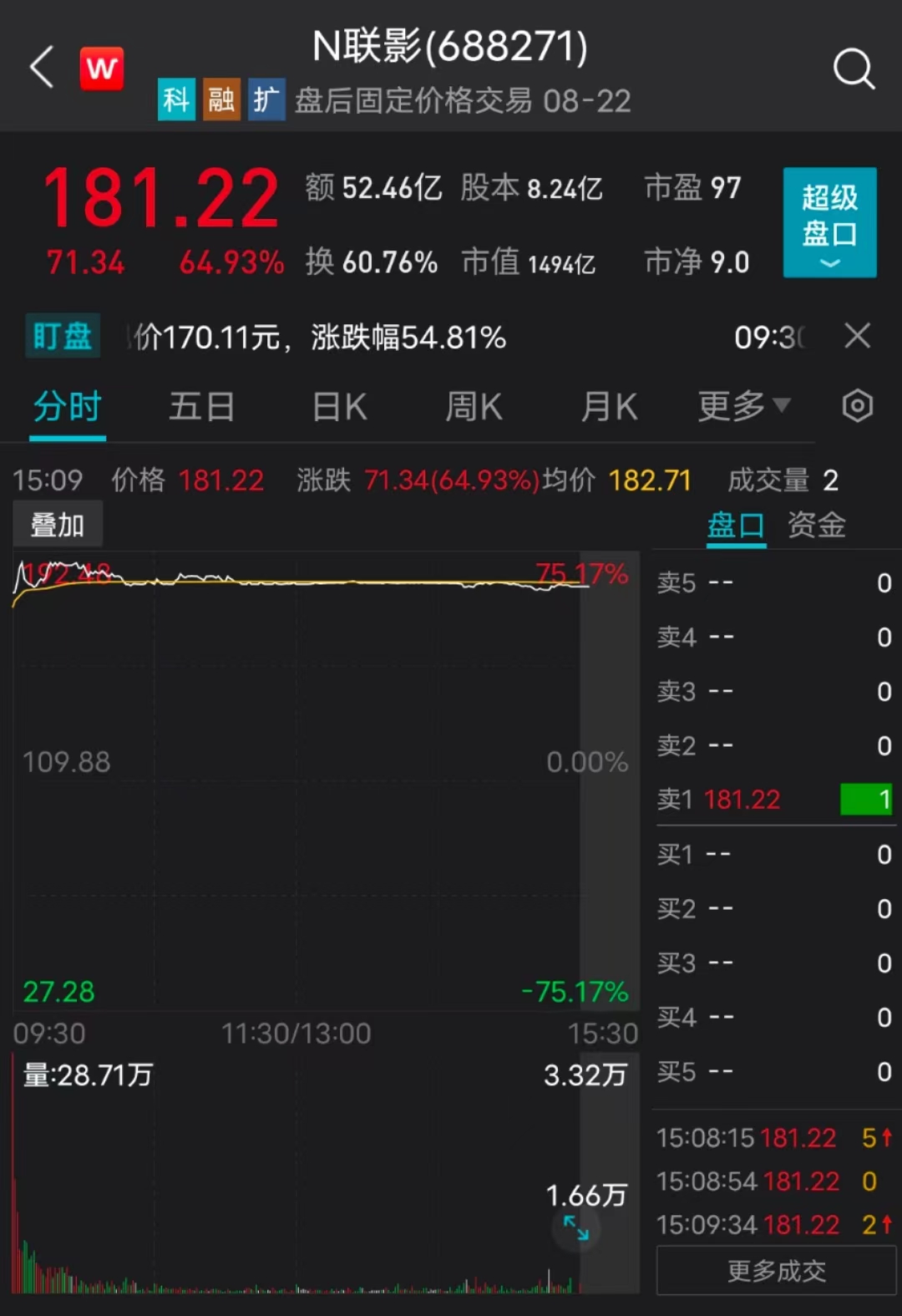 上市首日,聯(lián)影醫(yī)療股價(jià)高歌猛進(jìn)。據(jù)Wind數(shù)據(jù),聯(lián)影醫(yī)療今日高開54.81%,盤中一度漲超70%,報(bào)每股192.48元。截至今日收盤,聯(lián)影醫(yī)療報(bào)每股181.22元,收漲64.93%,市值1494億元。