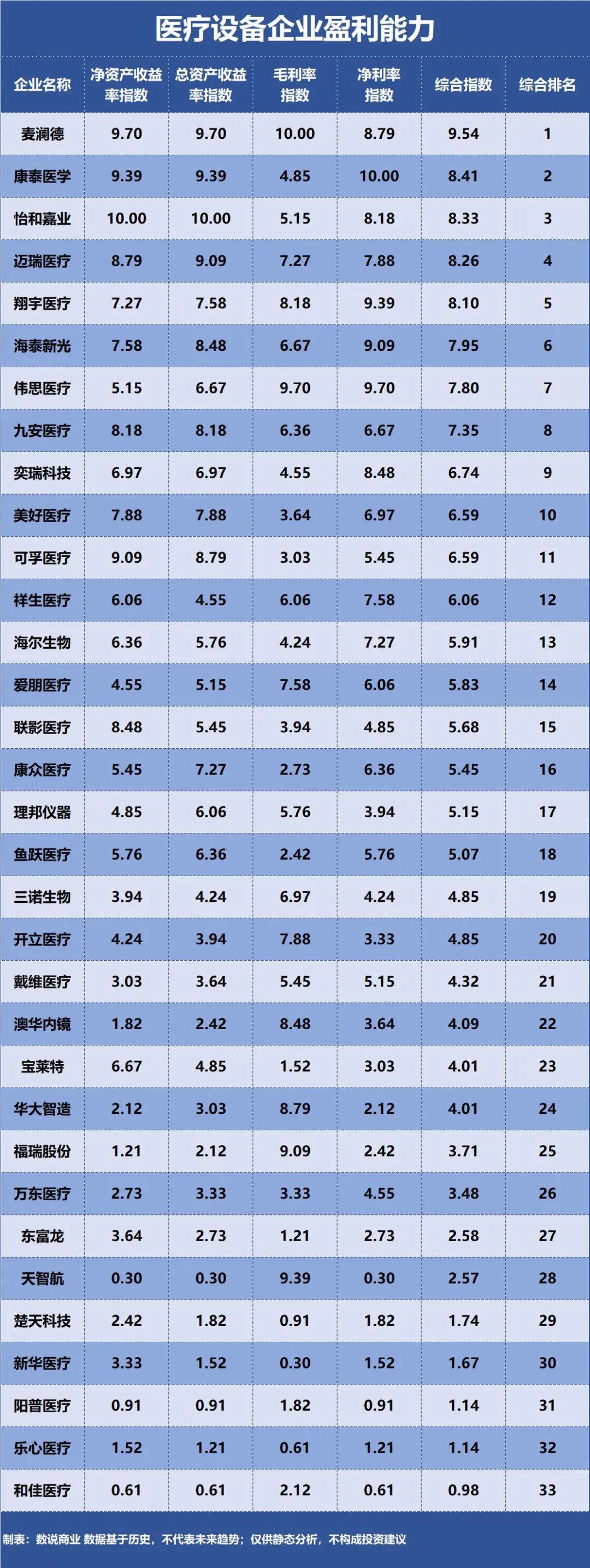 注:盈利能力榜單中,各項指標按照10/33的比例換算得出,綜合指數(shù)為各項指標的平均值。如某個指標有數(shù)值,但沒有指數(shù)(即表格為空格),則該指標權重會下降。