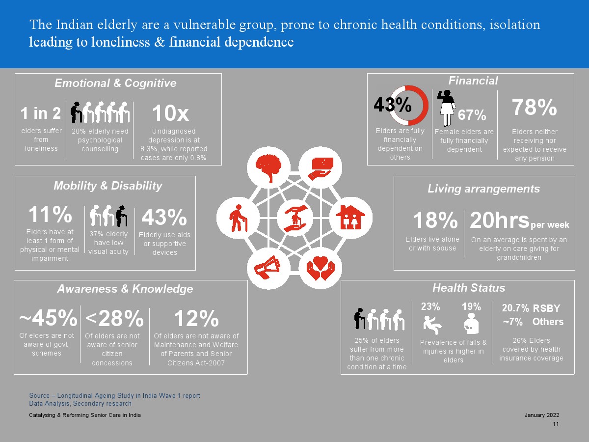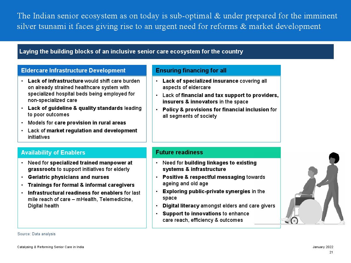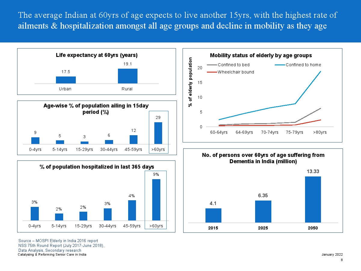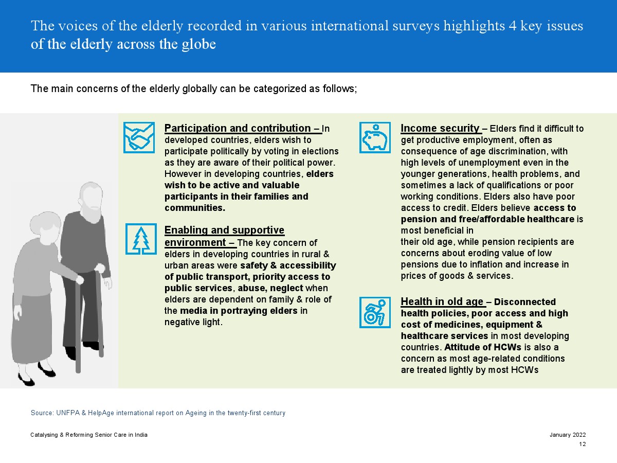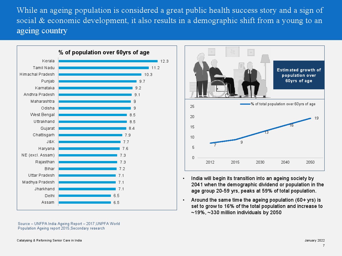 印度老年人協(xié)會發(fā)布了新報告“促進(jìn)和改革印度老年人護(hù)理”。目前,印度享有年輕人口紅利。但到2050年,老齡化人口將增長到約3.3億人。老年人口的增長、預(yù)期壽命的延長、負(fù)擔(dān)能力的提高、疾病負(fù)擔(dān)的轉(zhuǎn)移和家庭結(jié)構(gòu)的變化正在推動對醫(yī)療和非醫(yī)療老年護(hù)理的需求。隨著人口老齡化的加劇,對護(hù)理和資源的需求將會增加。由于老年人將在未來30年內(nèi)占該國人口的20%,因此印度必須立即采取行動。