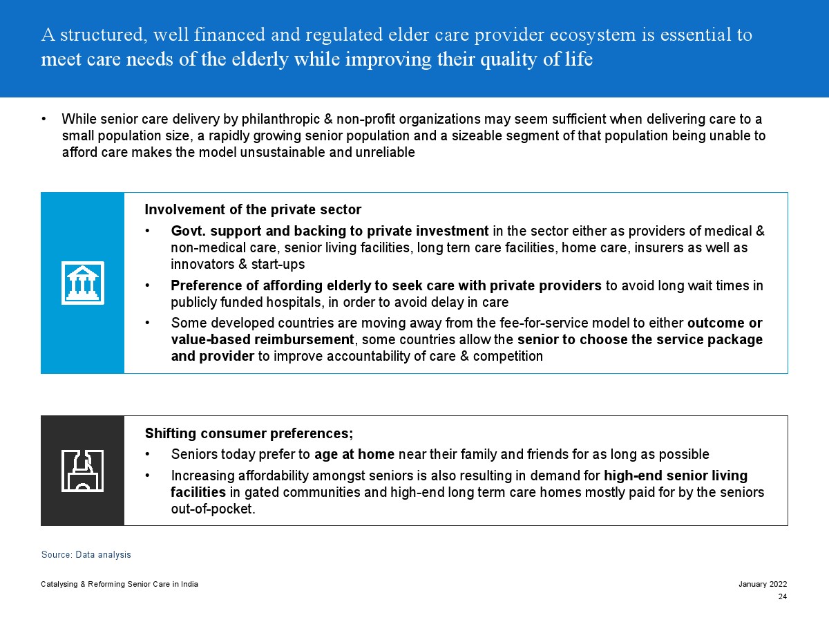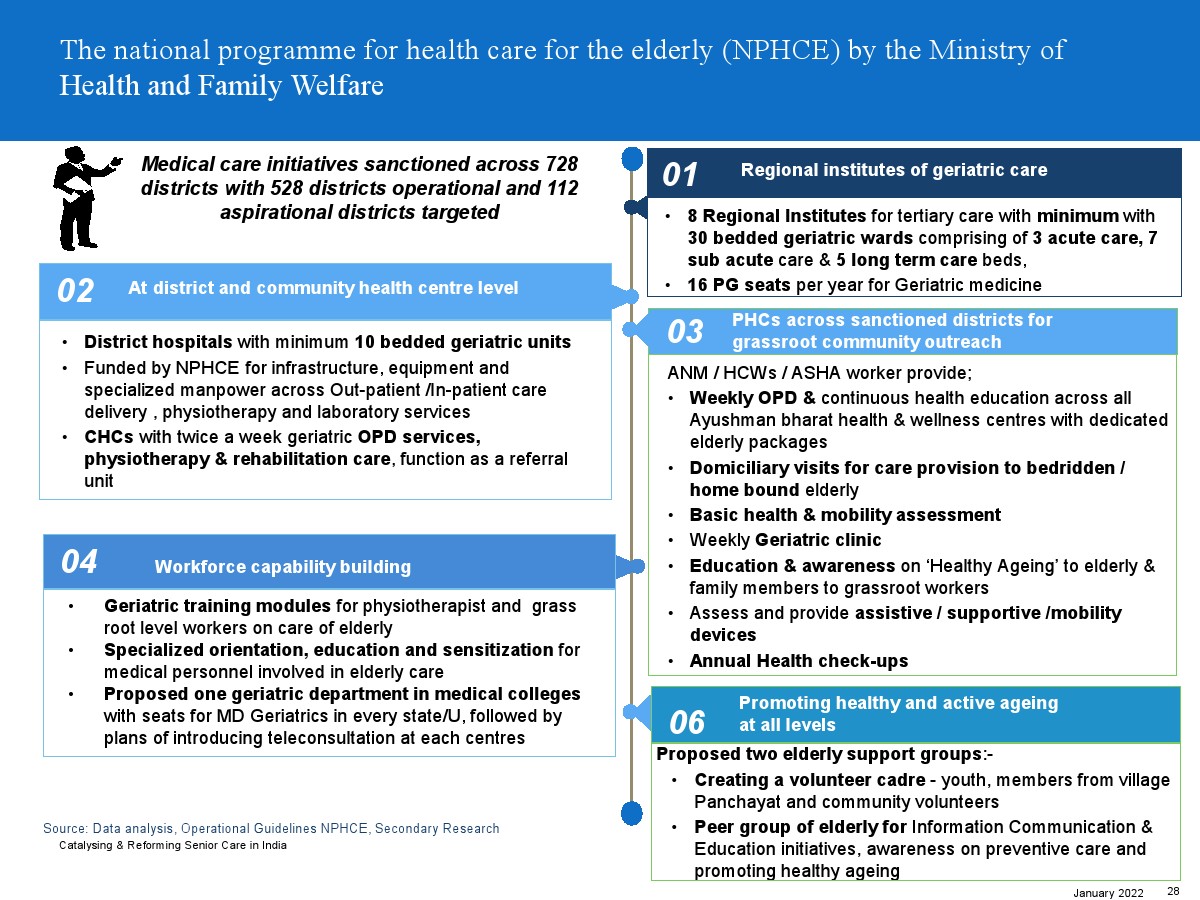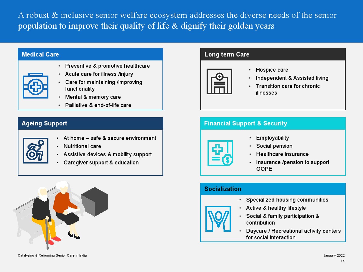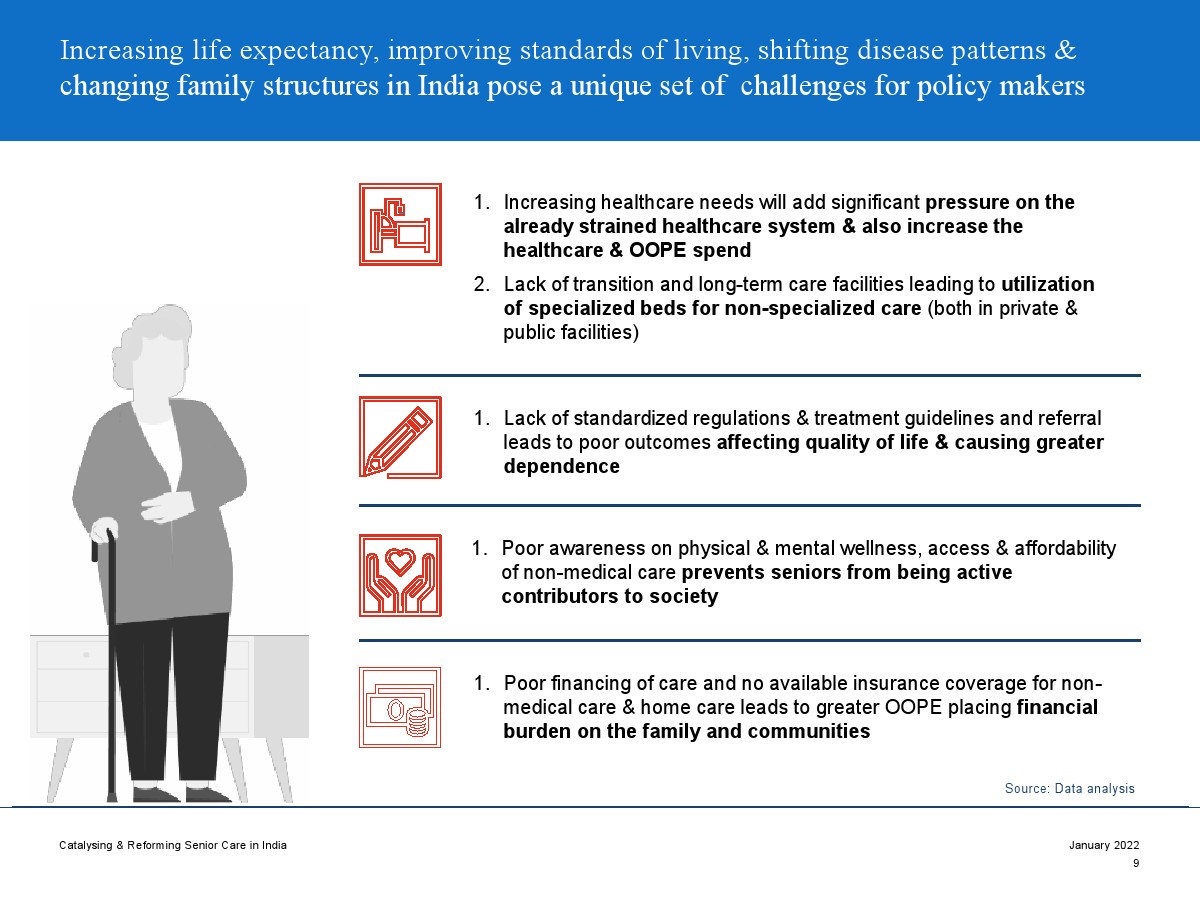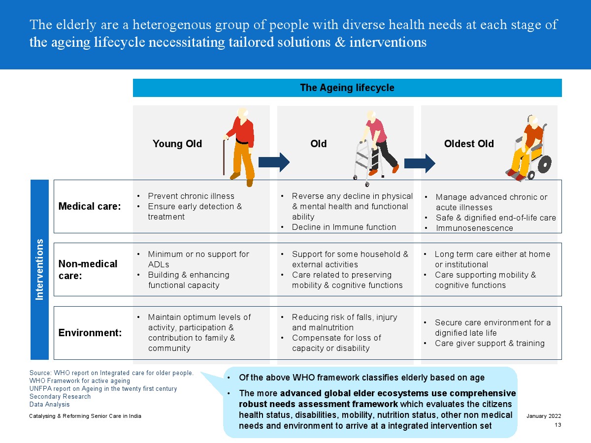印度老年人協(xié)會發(fā)布了新報告“促進(jìn)和改革印度老年人護(hù)理”。目前,印度享有年輕人口紅利。但到2050年,老齡化人口將增長到約3.3億人。老年人口的增長、預(yù)期壽命的延長、負(fù)擔(dān)能力的提高、疾病負(fù)擔(dān)的轉(zhuǎn)移和家庭結(jié)構(gòu)的變化正在推動對醫(yī)療和非醫(yī)療老年護(hù)理的需求。隨著人口老齡化的加劇,對護(hù)理和資源的需求將會增加。由于老年人將在未來30年內(nèi)占該國人口的20%,因此印度必須立即采取行動。